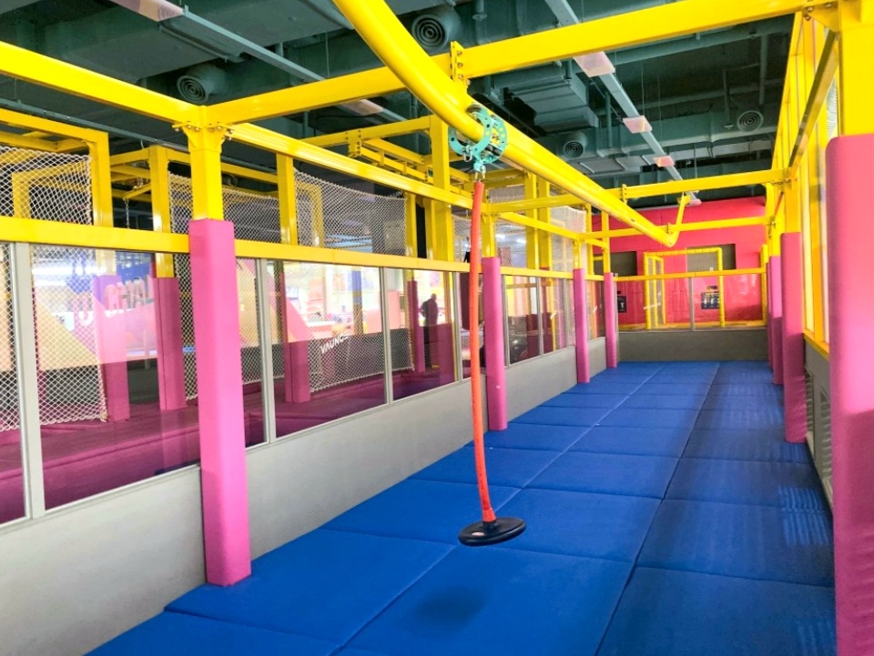 15m길이의 하강형 짚라인이에요. 아이가 손으로는 줄을 꼭 잡고, 다리는 꼬아서 줄을 껴안는 형태로 타는 거 아시죠? 혹 아이가 떨어져 다치면 어쩌나 걱정이 되시는 부모님들은 걱정마세요. 센터 내에서 교육을 받고, 다양한 경력을 갖고 있는 바운스 히어로(직원)분들이 항시 대기하며 운영을 돕고 있거든요. 시원하게 앞으로 뻗어나갔다가 돌아오는 짚라인, 저도 타고싶더라고요.