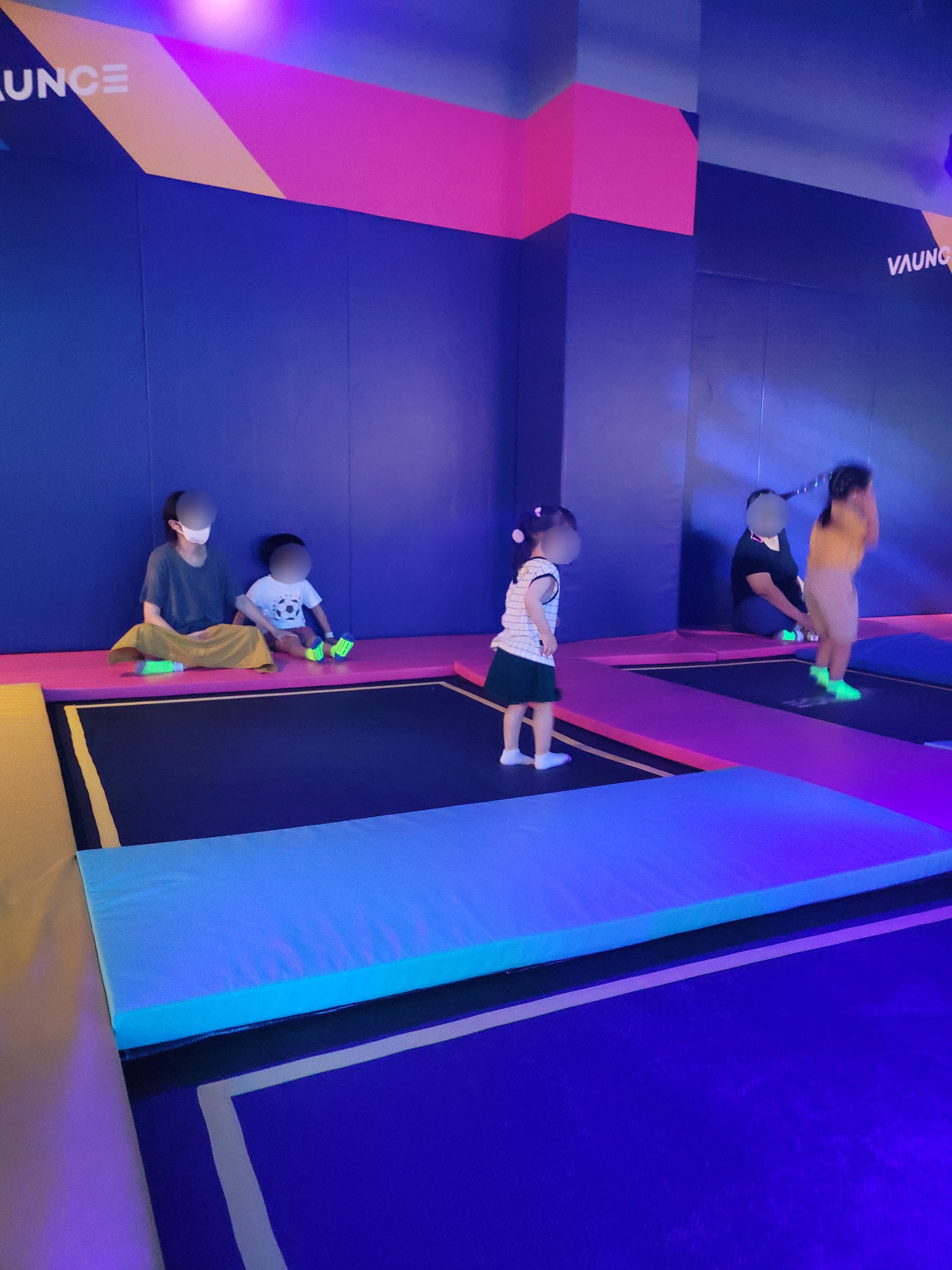 위에서 느껴지는 높이는 이 정도예요. 하지만 막상 올라오니 정글짐엔 아이들이 별로 없더라고요. 왜? 저는 옆으로 고개를 돌리고 그 이유를 알았어요. 바로 바운스프램폴린파크의 자랑! 트램폴린존에서 피버나잇 댄스파티가 진행중이었는데요.