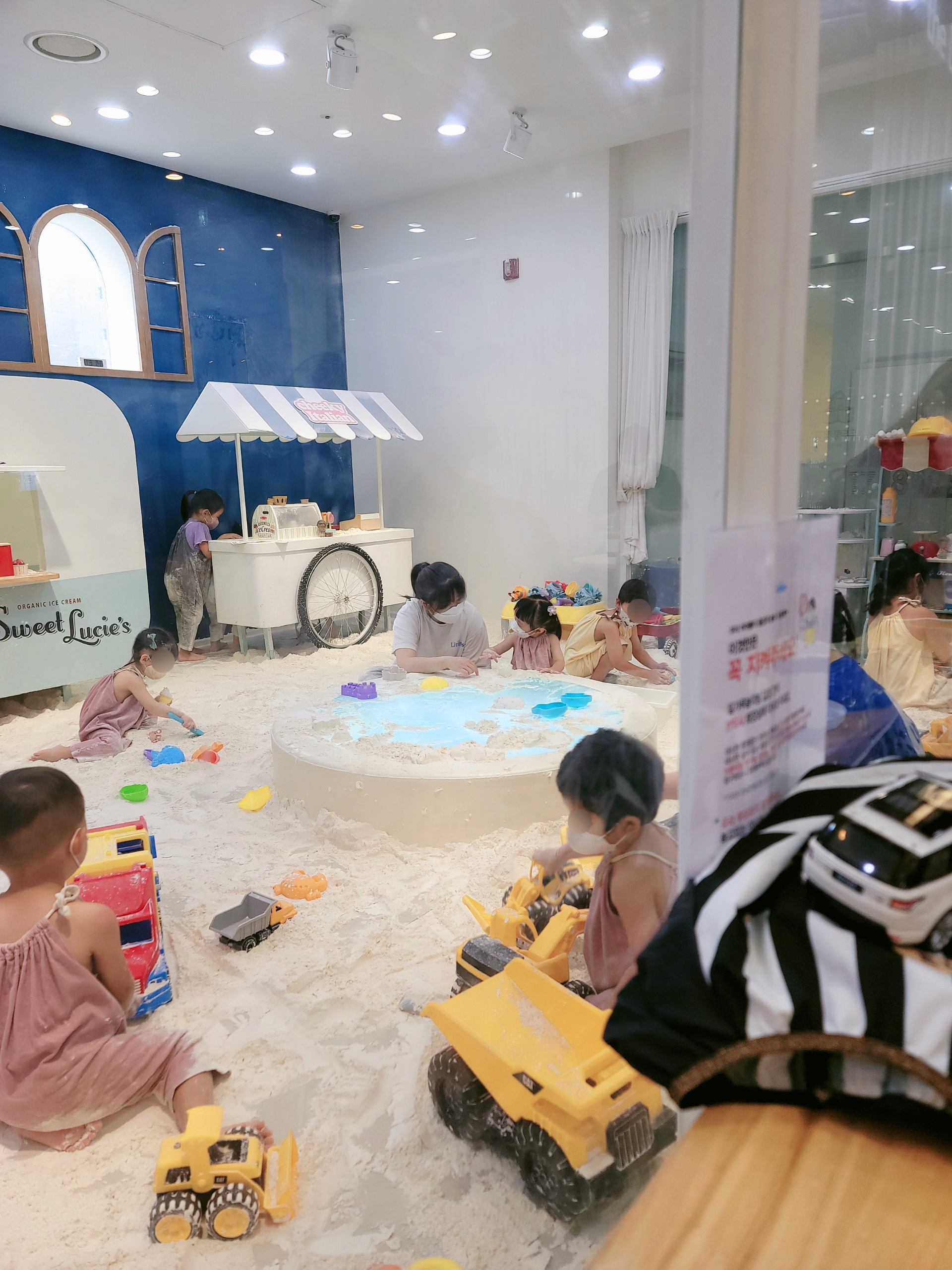 이 안에는 한 번에 10명까지의 인원이 들어올 수가 있는데, 아이들의 연령은 모두 제각각이었어요. 3살부터 7살까지도 있는 것 같았습니다. 그리고 다양한 아이들이 다함께 들어간거니만큼 내 아이에게 의도치않게 혹은 의도해서 밀가루를 뿌리는 경우가 있기도 해요. 그걸 선생님이 보지 못해 제지하지 못 하면 지켜보는 부모님은 속상하죠. 어른들은 통유리 밖에서 바라만 봐야 하거든요.