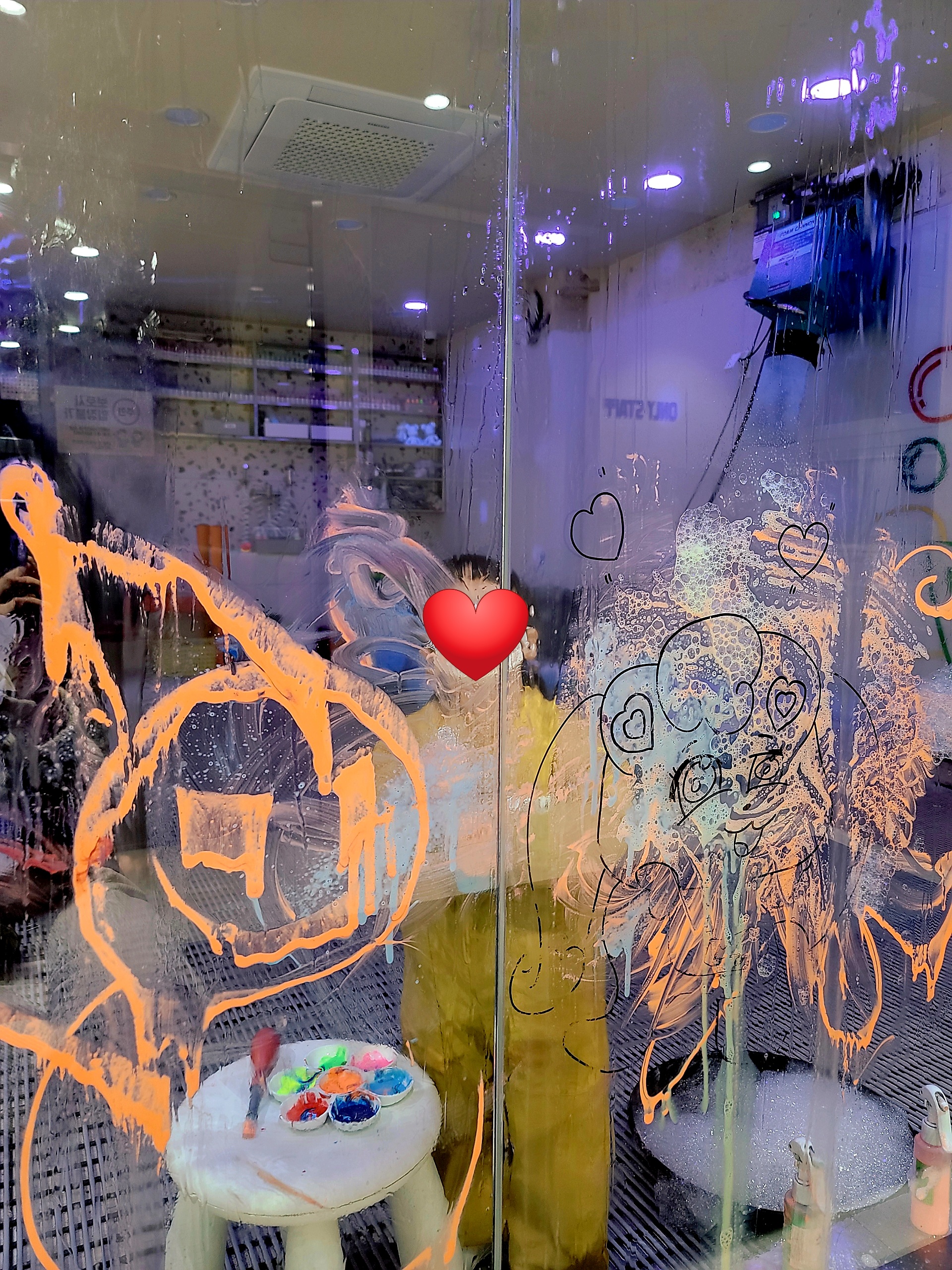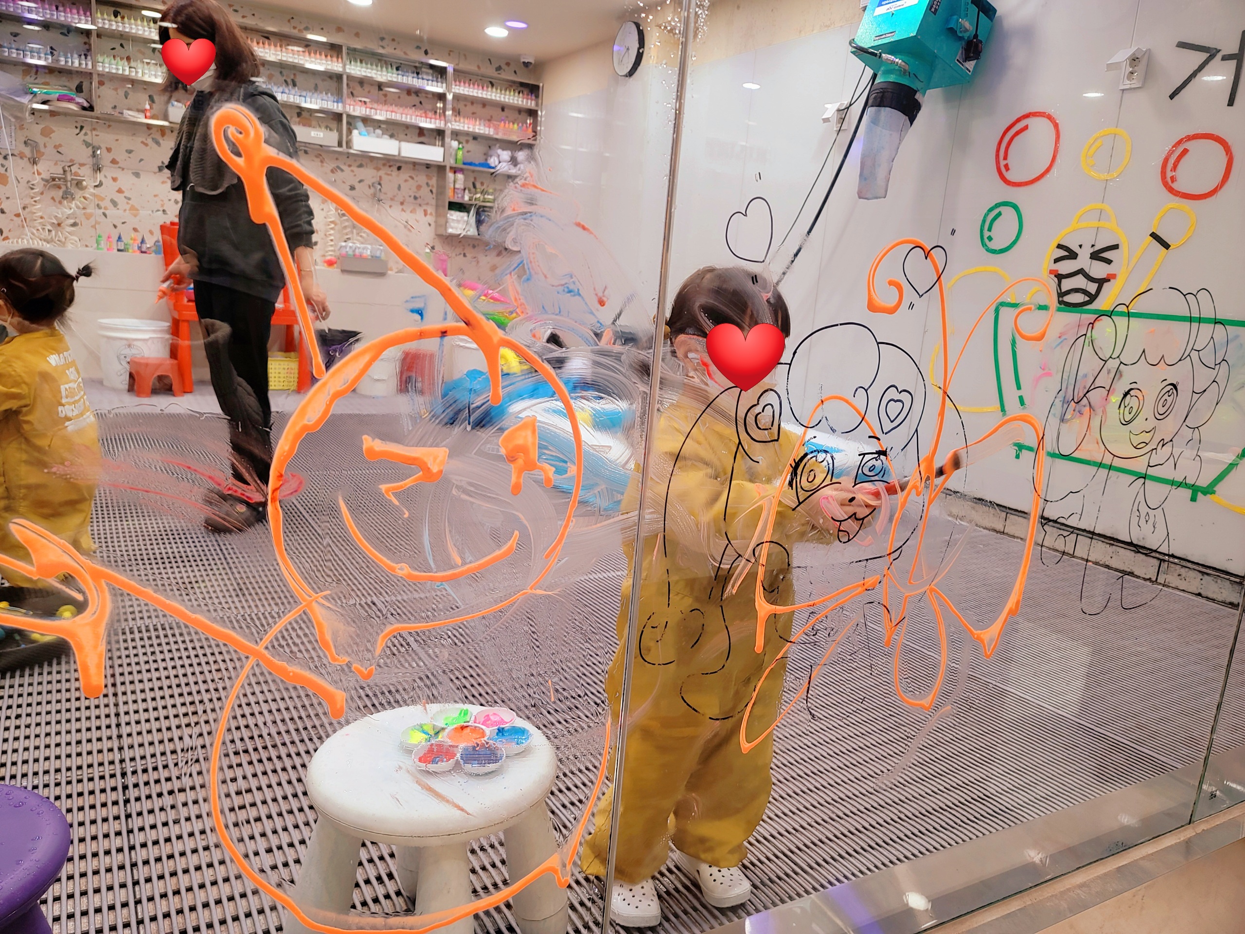 마지막, 물감 놀이 시간이에요. 마찬가지로 창의 놀이가 끝나고 10분 쉰 다음 5시 30분에 입장 했어요. 우리 아이와 다른 친구들 두 명이 함께 들어갔는데, 서로 사이좋게 지내거나 싸우거나 하지 않고 제각기 자기 할 일들만 하는 게 귀여웠습니다. 선생님이 물감 두 개와 개인당 붓을 나누어주셨어요. 맨 처음엔 벽에 물감을 칠해보는 일로 스타트를 끊었습니다.