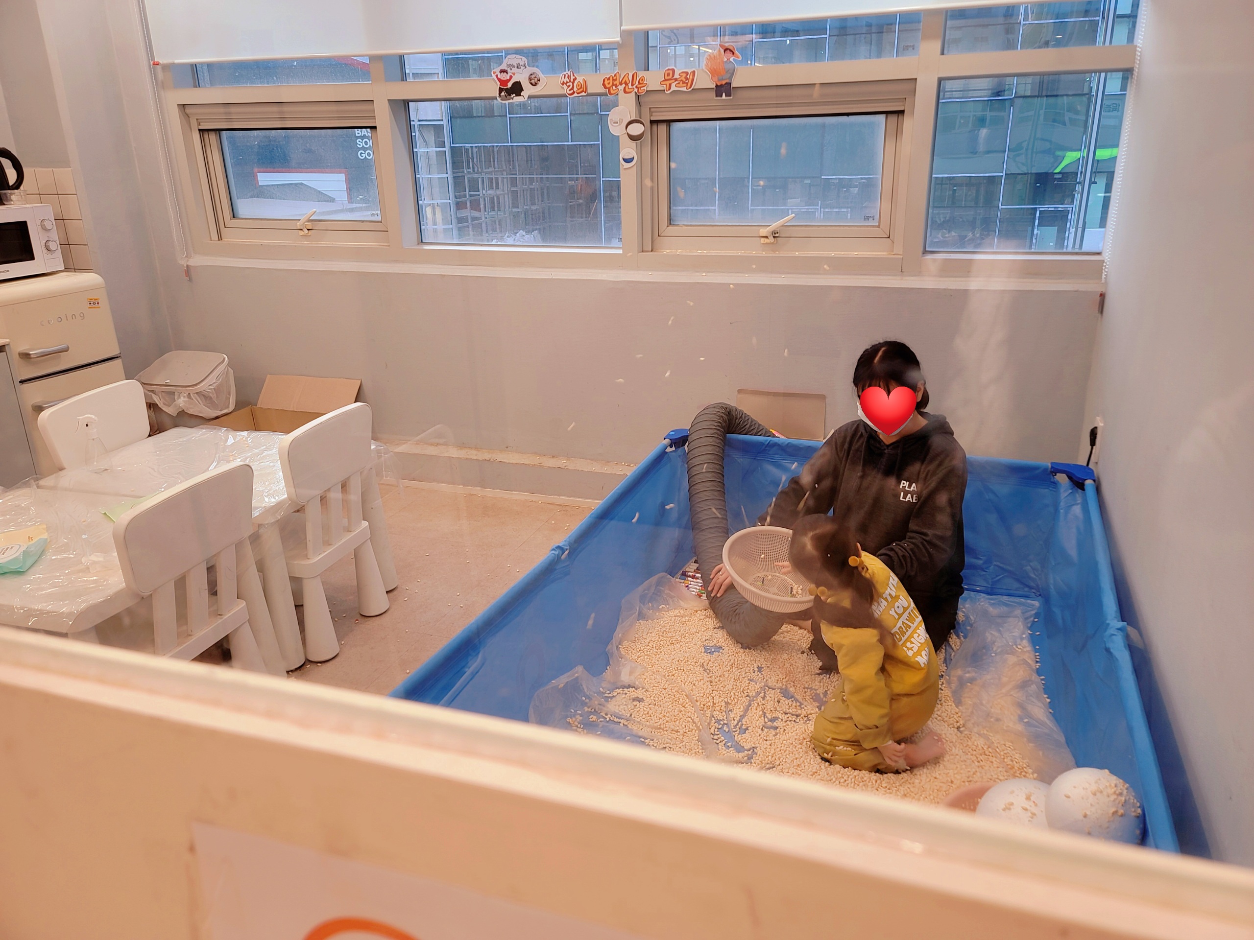 그리고 거센 바람이 나오는 호스와 연결된 소쿠리가 하나 있었는데요. 바람을 작동시키자 소쿠리에 있던 튀밥이 사방으로 튀었어요. 아이가 무척 좋아했습니다. (밖에 있던 저도 좋아했어요) 그 후로는 선생님과 튀밥을 던지며 놀더군요. 조금 과격하다 싶을 정도로... 심지어는 선생님에게 튀밥을 던지기에 밖에서 X자를 취하며 그러면 안 된다는 신호를 보냈는데, 아이는 그런 저를 보지 못 했어요. 수업이 끝나고 제가 선생님께 사과했습니다. 참고로 창의 선생님이 이전에 흙 놀이를 진행 해주신 분이셨거든요. 친절하게 괜찮다고 말씀 해주셔서 감사했어요.