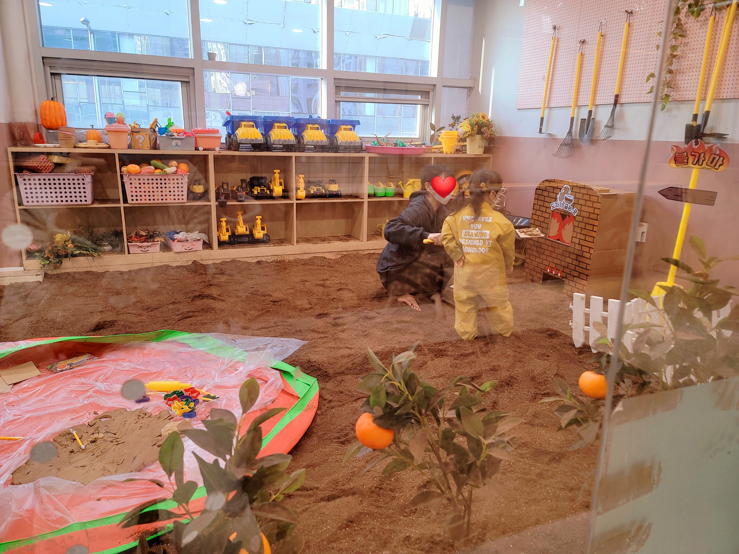 그 후에는 밖에 있는 흙을 만져 보았는데, 다른 많은 도구들 중 우리 아이는 꽃을 가져와 심어보는 활동을 했어요. 삽으로 파서 자리를 만들고 그 위에 야무지게 심더군요. 꽃을 심은 후에는 모양틀을 가지고 놀고, 삽이나 뜰채 같은 도구를 이용해 놀기도 했습니다. 포크레인, 헬맷, 공룡, 채소 등 갖가지 장난감들도 많았지만 우리 아이는 비교적 한 자리에 엉덩이 붙이고 얌전히 놀았어요.