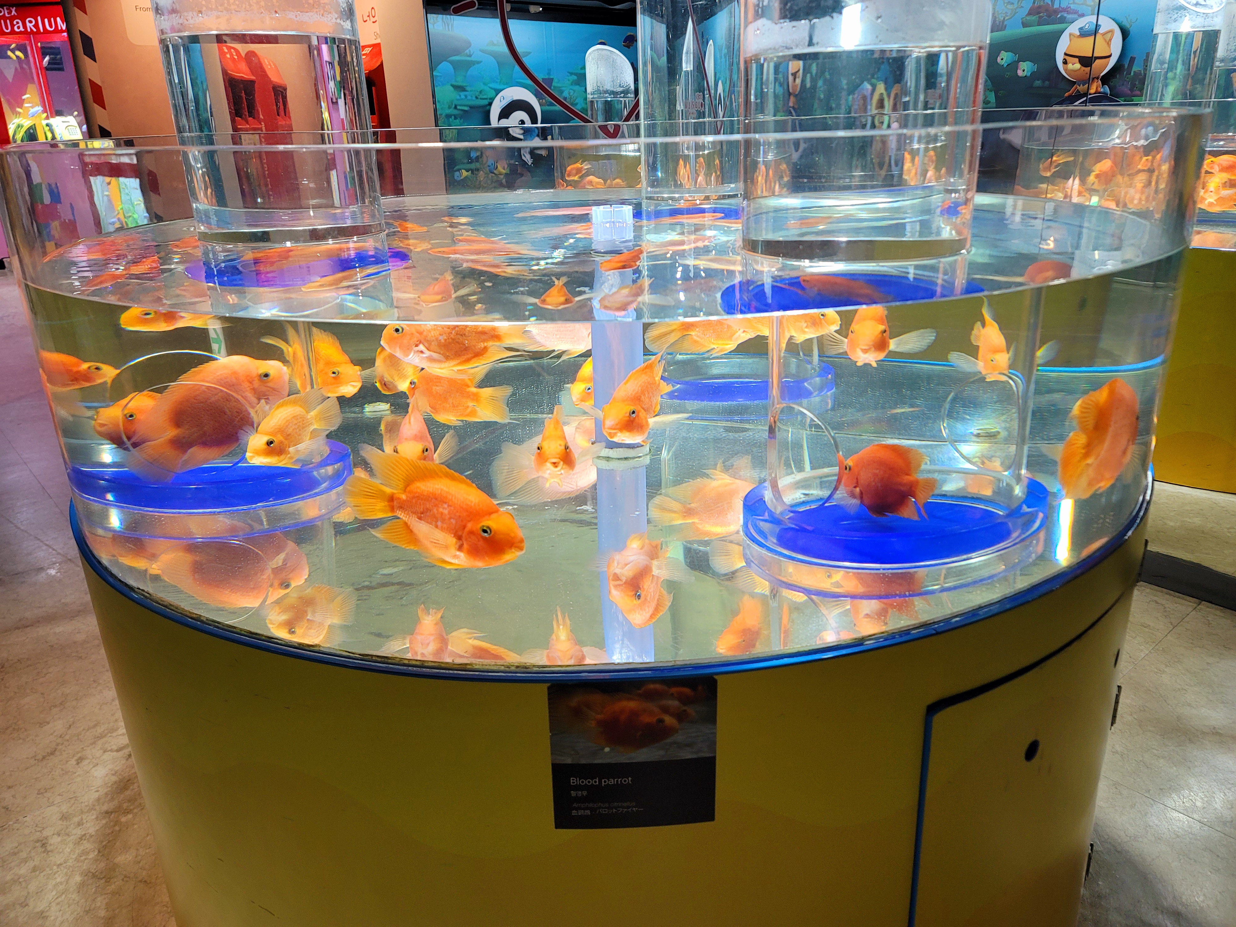 혈앵무예요. 해양생물 잘 모르는 저는 속으로 '색깔이 예쁘다', '붕어 닮았다' 이 따위 생각이나 하고 있었지만 아이에게는 꼬박꼬박 이름을 알려주었어요.