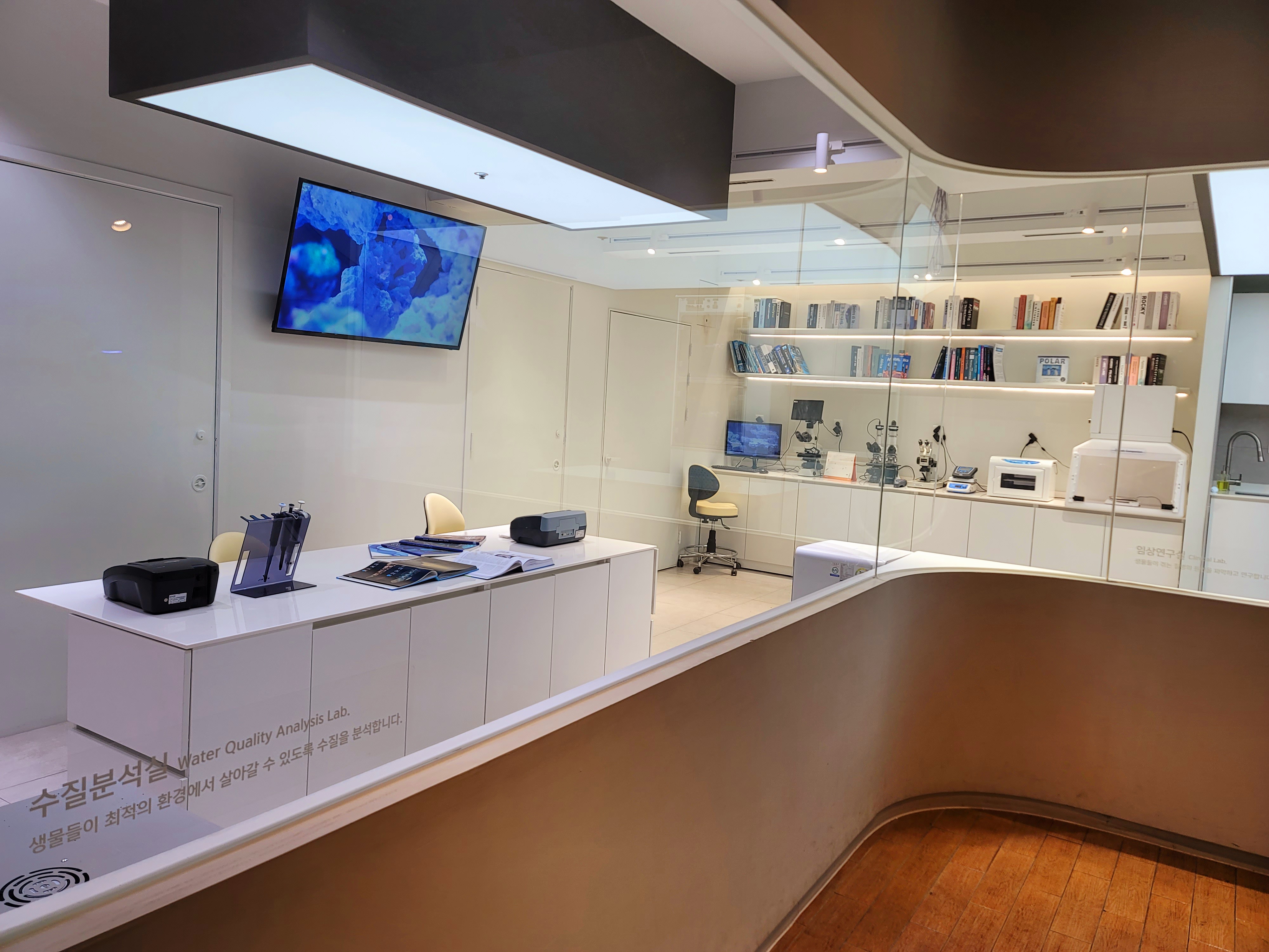 수질분석실, 그리고 그 옆에는 임상연구실도 있었어요. 수질분석실은 생물들이 최적의 환경에서 살아갈 수 있게 수질을 분석하는 곳이고요. 임상연구실은 생물들이 겪는 질병의 원인을 파악하고 연구하는 곳이라고 해요.