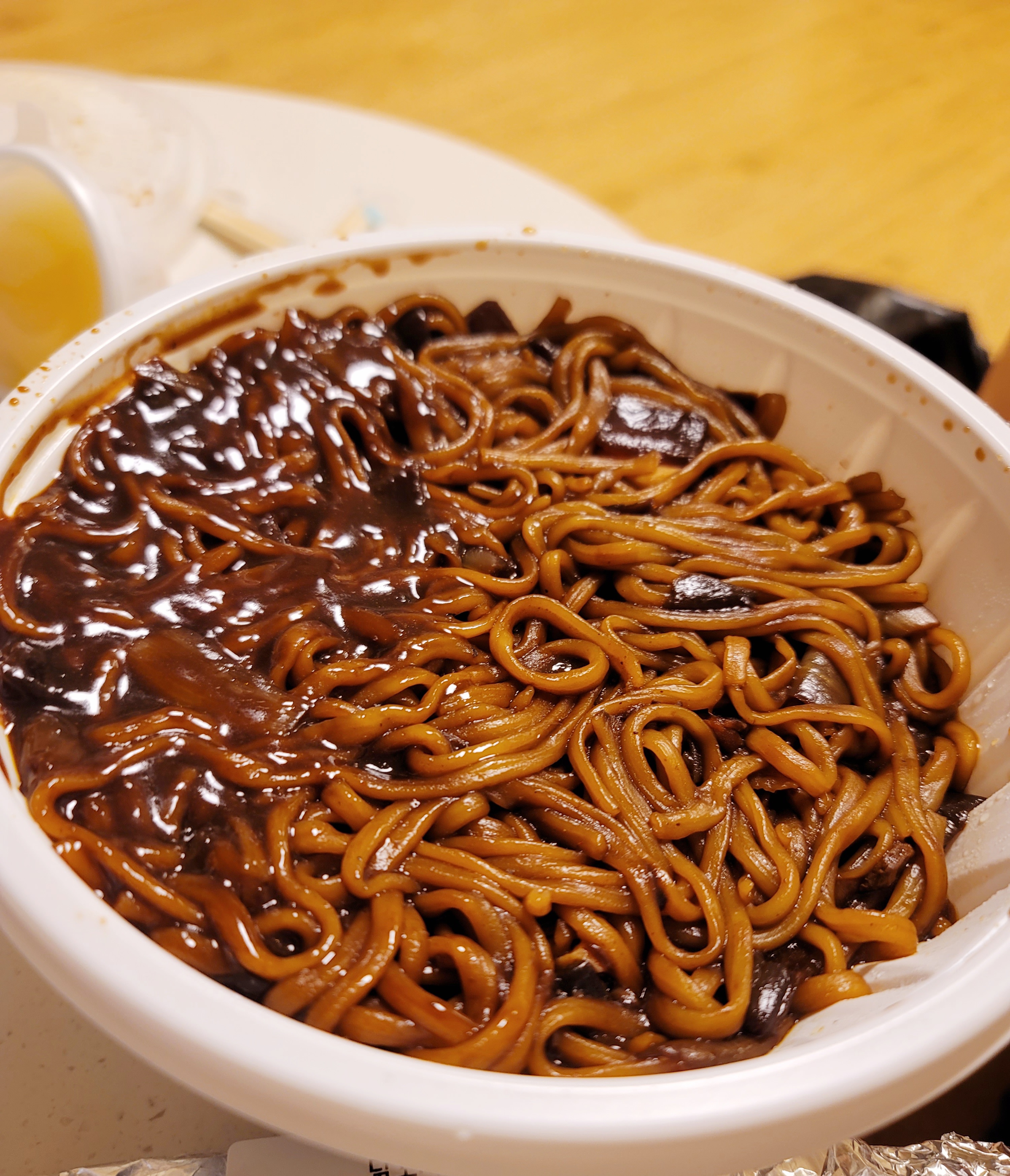 사진은 저녁으로 먹으려고 포장해 온 짜장면이에요. 그리고 소고기덮밥도 하나 포장해 왔었는데, 포장을 해 온 이유가 그 넓은 식당에 단 한 곳도 앉을 자리가 없어서였답니다.