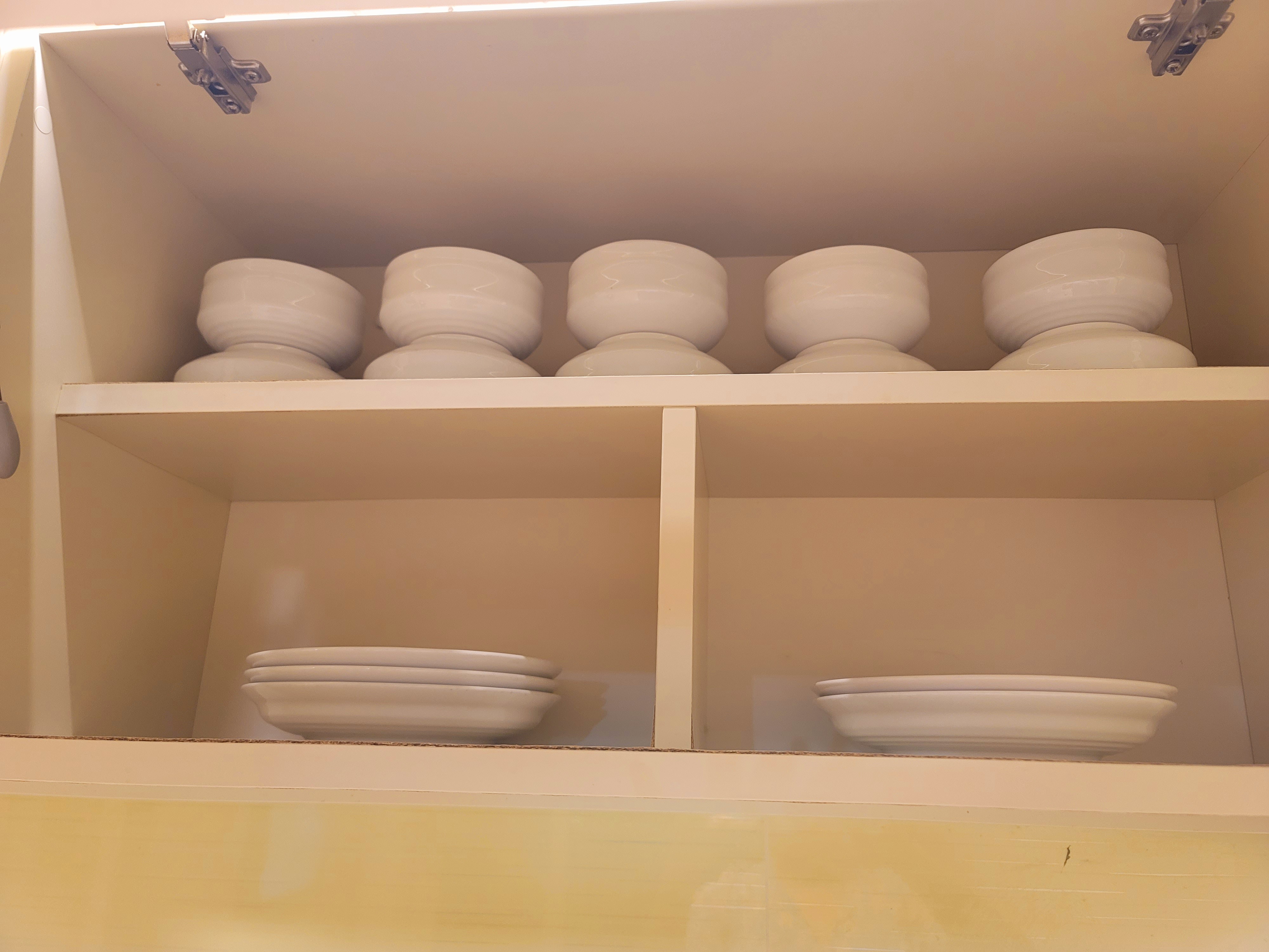 가지런히 정리되어 있는 그릇들. 사진으로보니 수저류도 그릇, 접시도 양이 참 넉넉하네요.