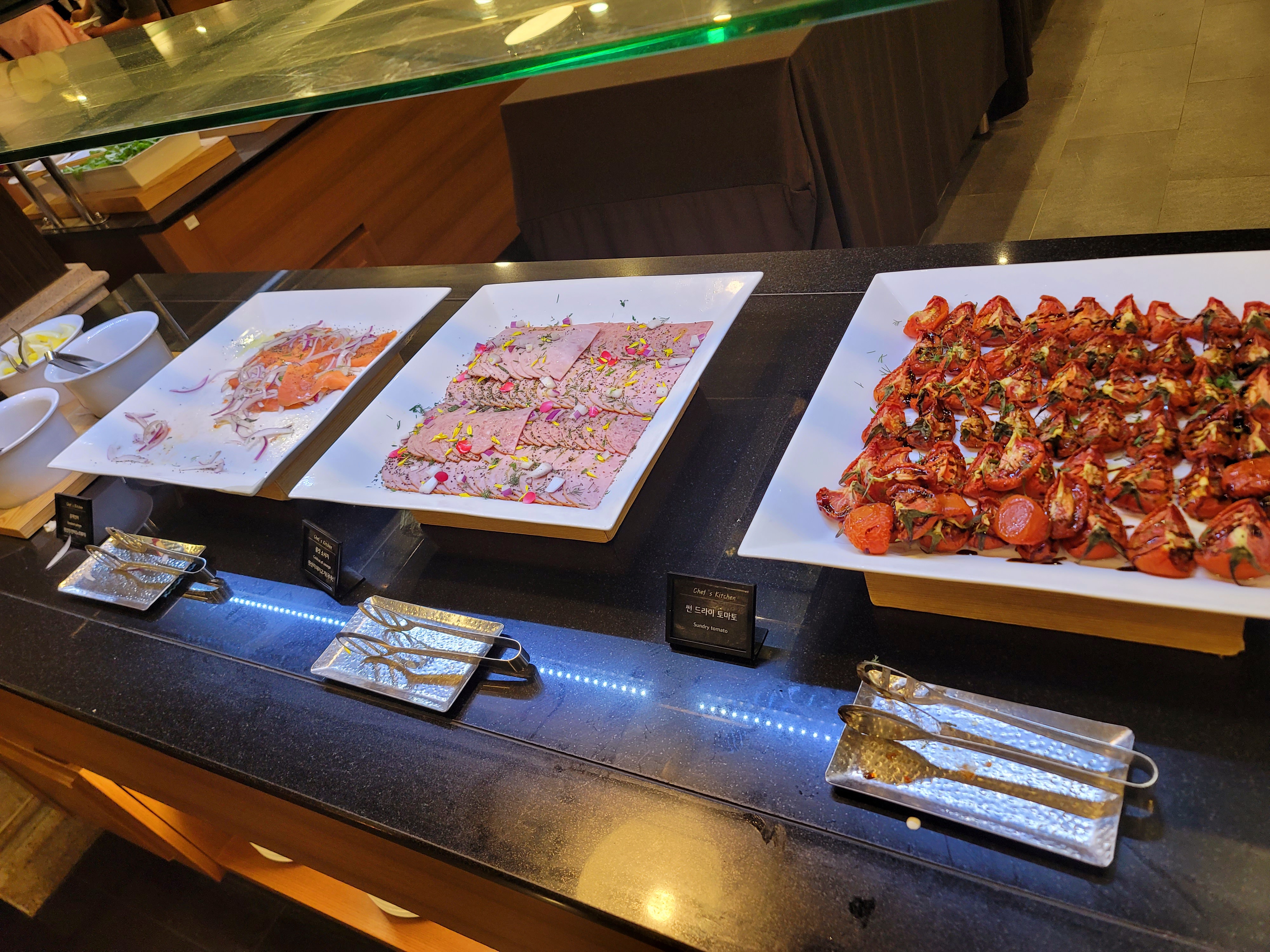 썬 드라이 토마토, 클컷 소시지, 훈제연어에요. 연어 옆에는 홀스래디쉬소스와 케이퍼 있으니 취향껏 담아가시면 되고요. 여기서도 소시지가 맛있긴 했지만 좀 차가워서 아쉬웠어요.