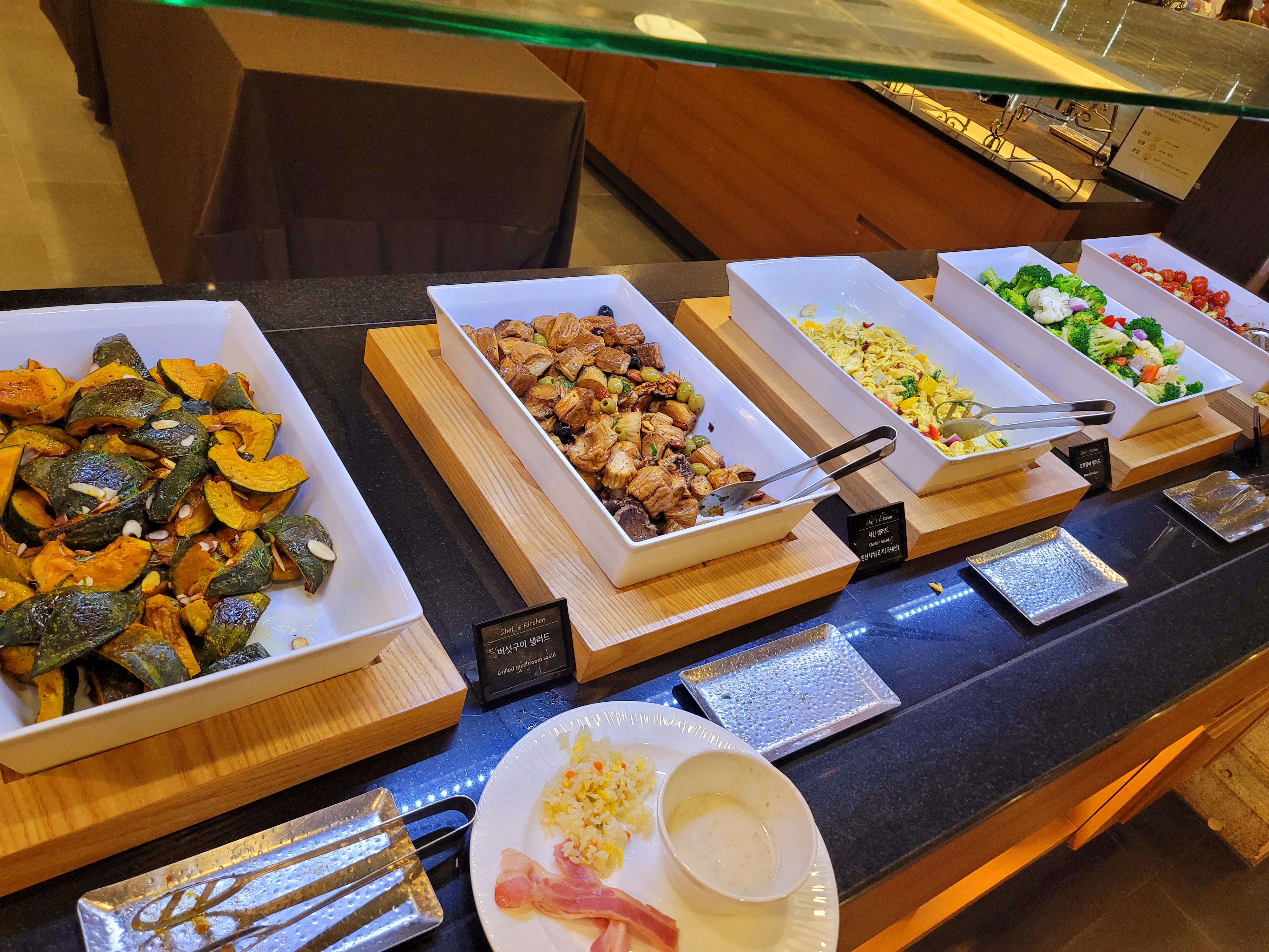 단호박, 버섯구이 샐러드, 치킨 샐러드, 브로콜리 샐러드가 보이네요. 모든 간이 다 세지 않아요. 어르신 분들 모시고 가도 좋겠죠? 아, 그런데 치킨 샐러드가 좀 너무 차갑긴 했어요.