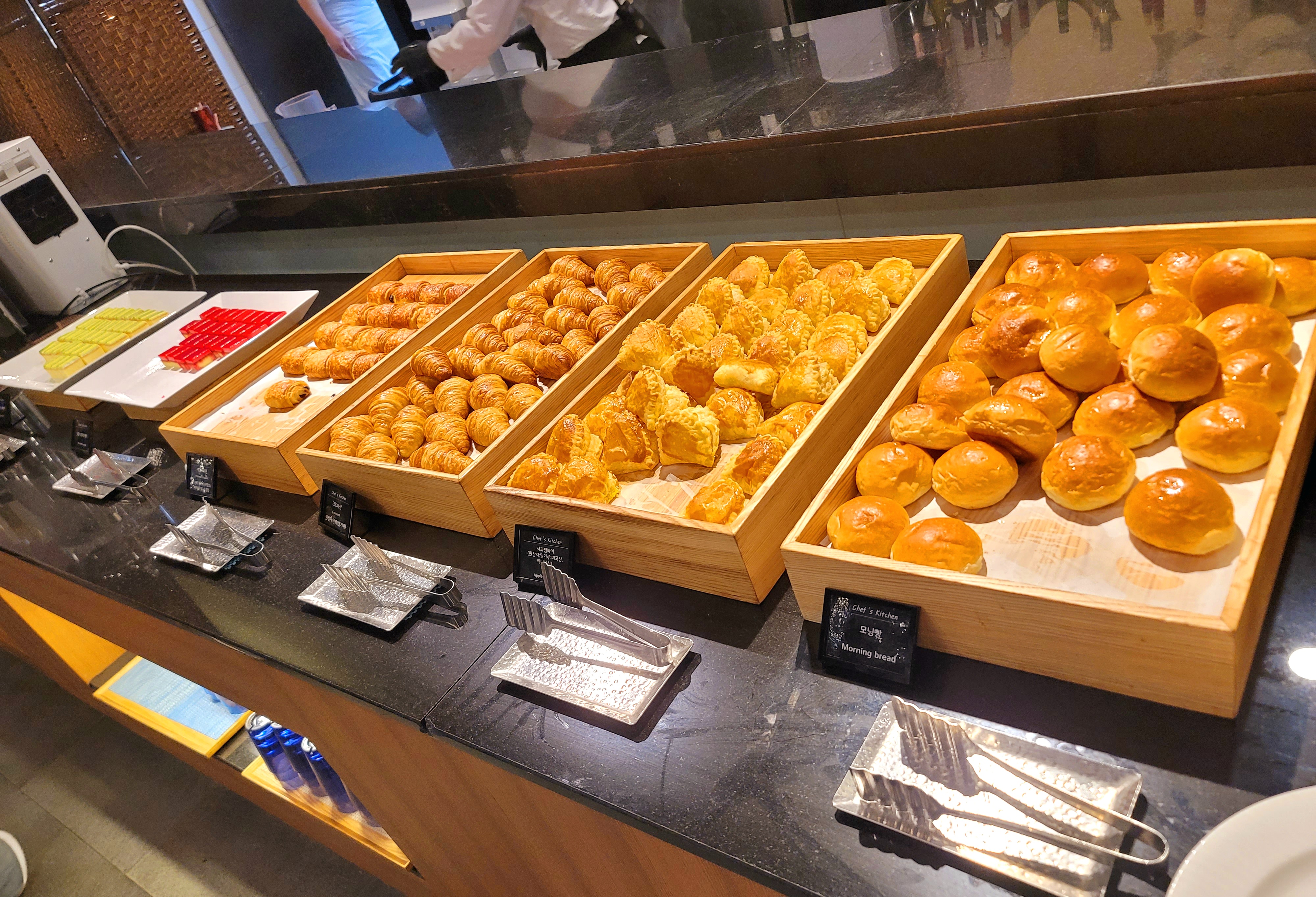 모닝빵, 사과잼파이, 크로아상등의 빵들이예요. 그 옆에 작은 케이크들도 있고요. 빵이 이 곳에만 있는 건 아닌데요.