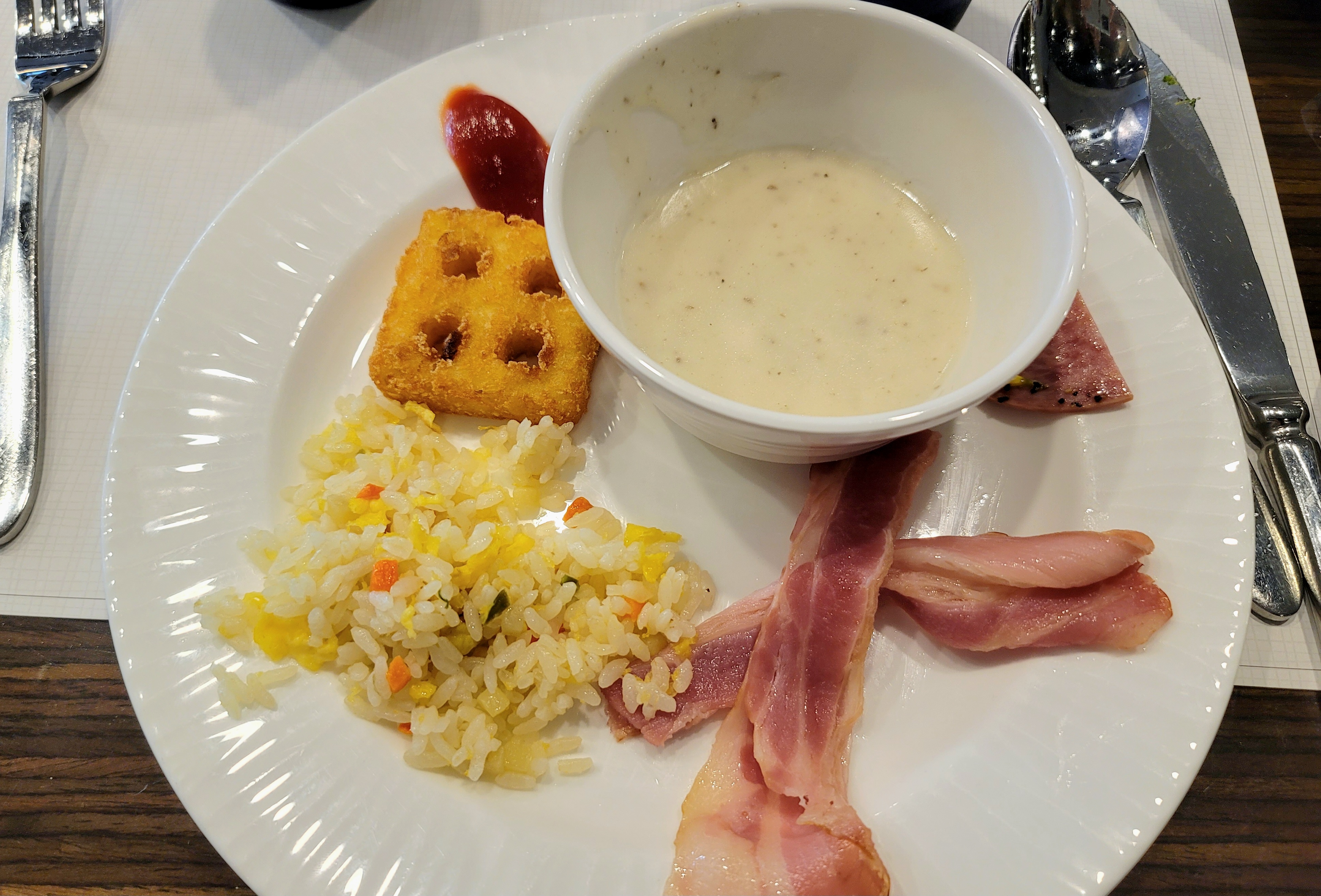 초등학생 먹으라고 담아온 거 아니고 서른 중반의 여성이 먹으려고 담아온 것... 베이컨은 좀 질긴 편이었고 해시브라운, 스프는 무난했어요.