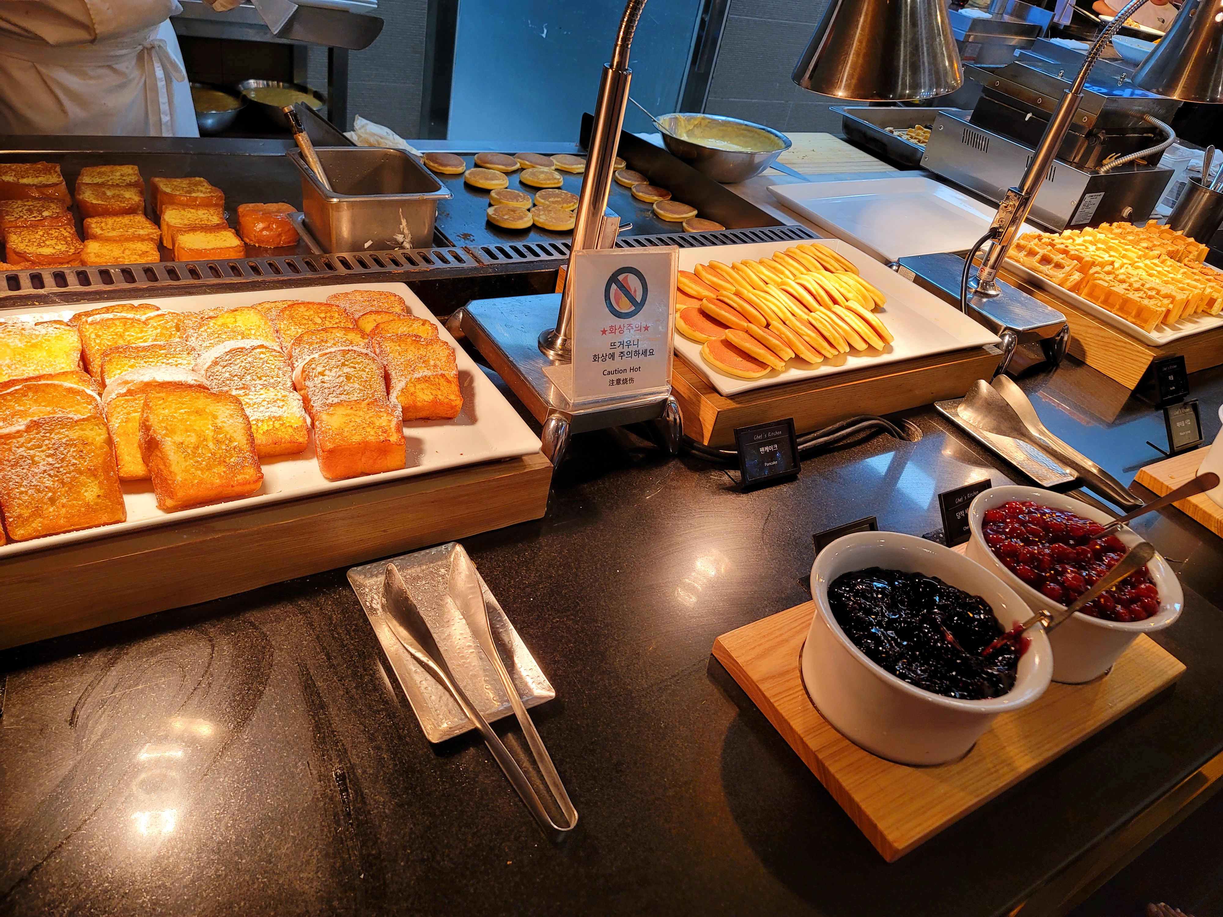 팬케이크와 와플, 프렌치토스트인데요. 프렌치토스트 위에 슈가파우더가 뿌려져 있어 달콤했어요. 퐁신했고요. 빵을 찾아다니는 건 이제 디저트 배 채우겠다는건데, 방심하면 여러 개 들어가겠더라고요.