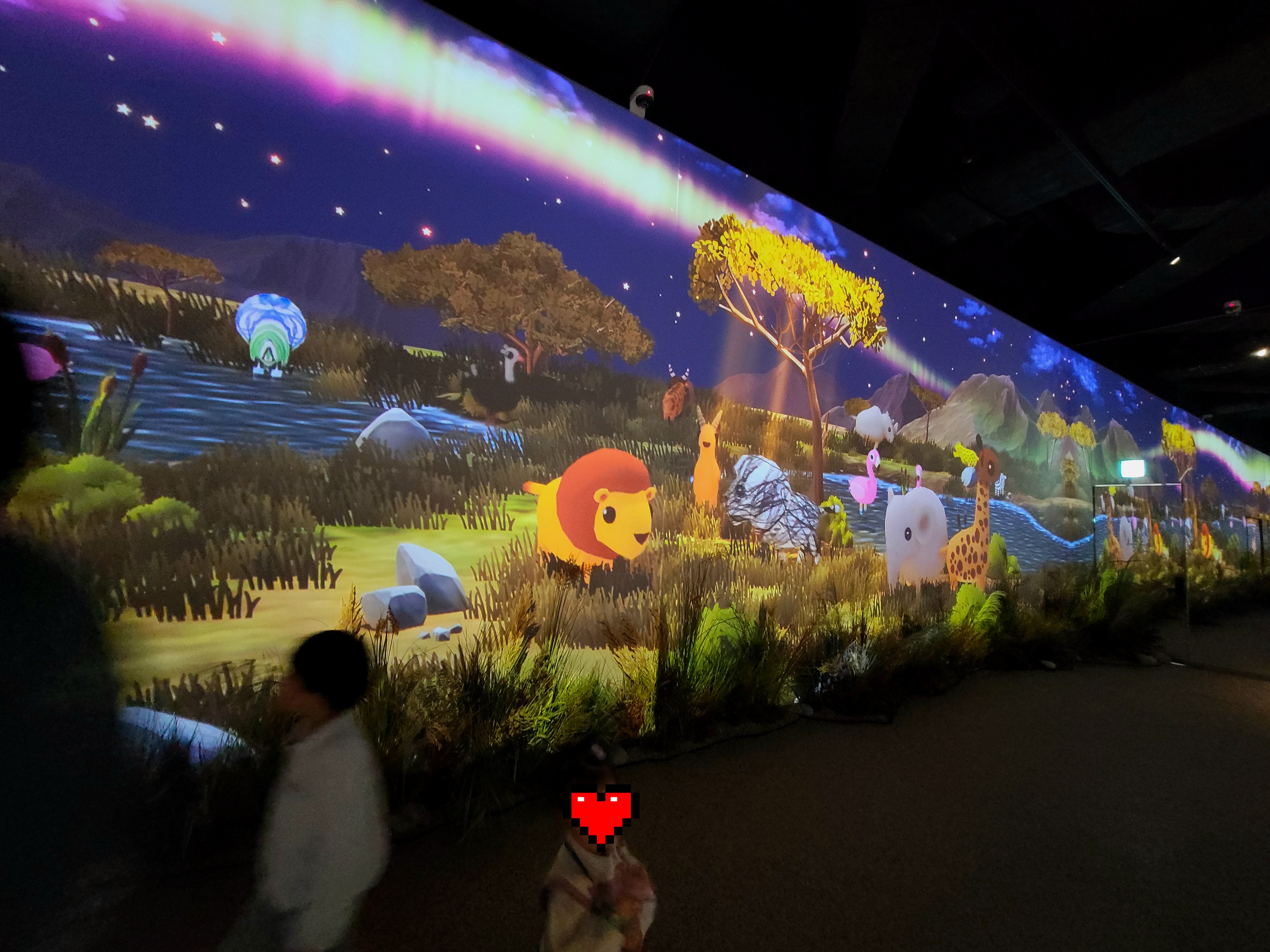 동물들이 사방을 둘러싸고 있는 미디어 아트존은 환상적이예요! 수풀 사이에서 동물들의 눈이 번뜩이지요👀 그 눈을 터치해주면 동물이 걸어나오니 참고해주세요.