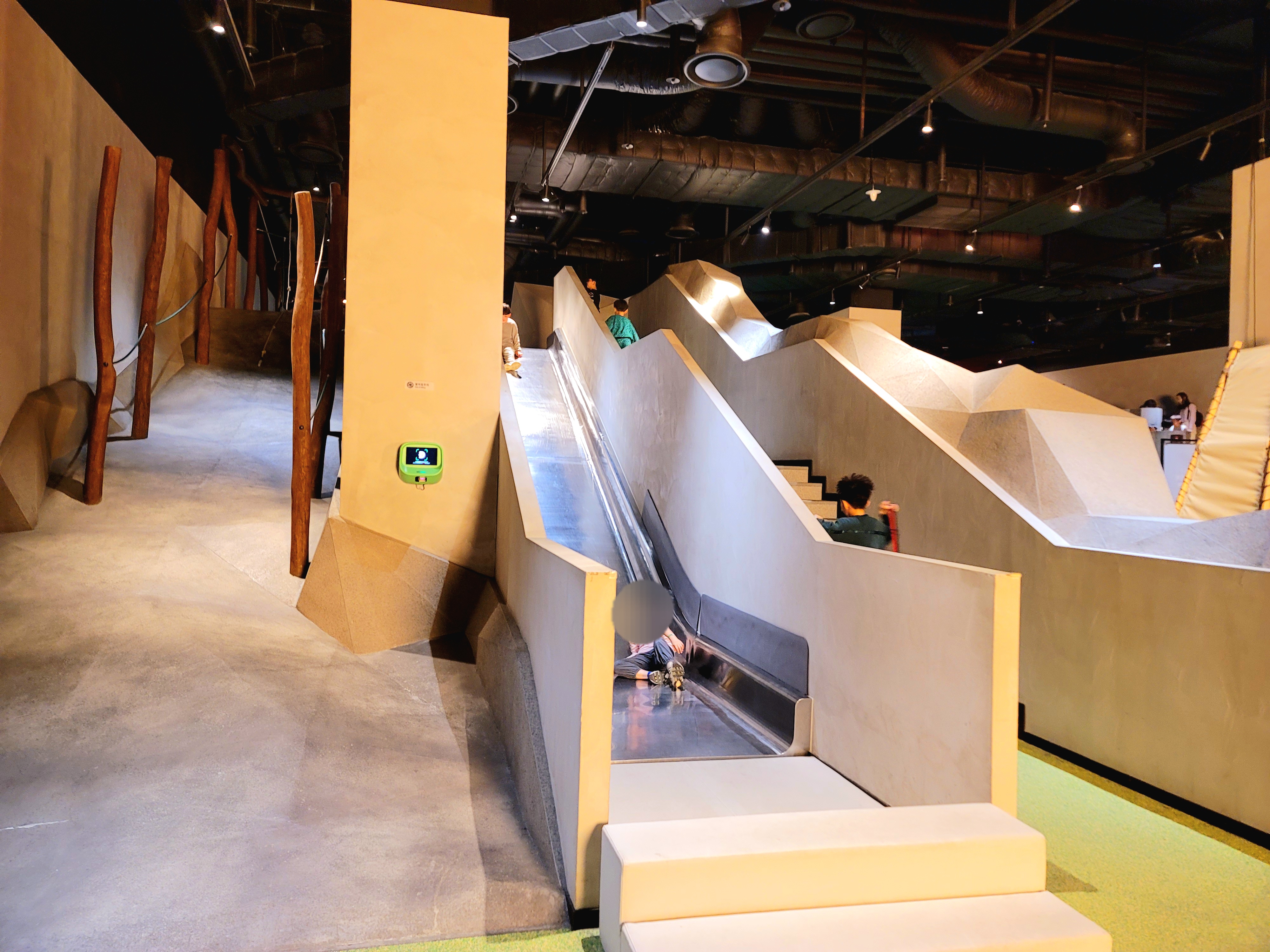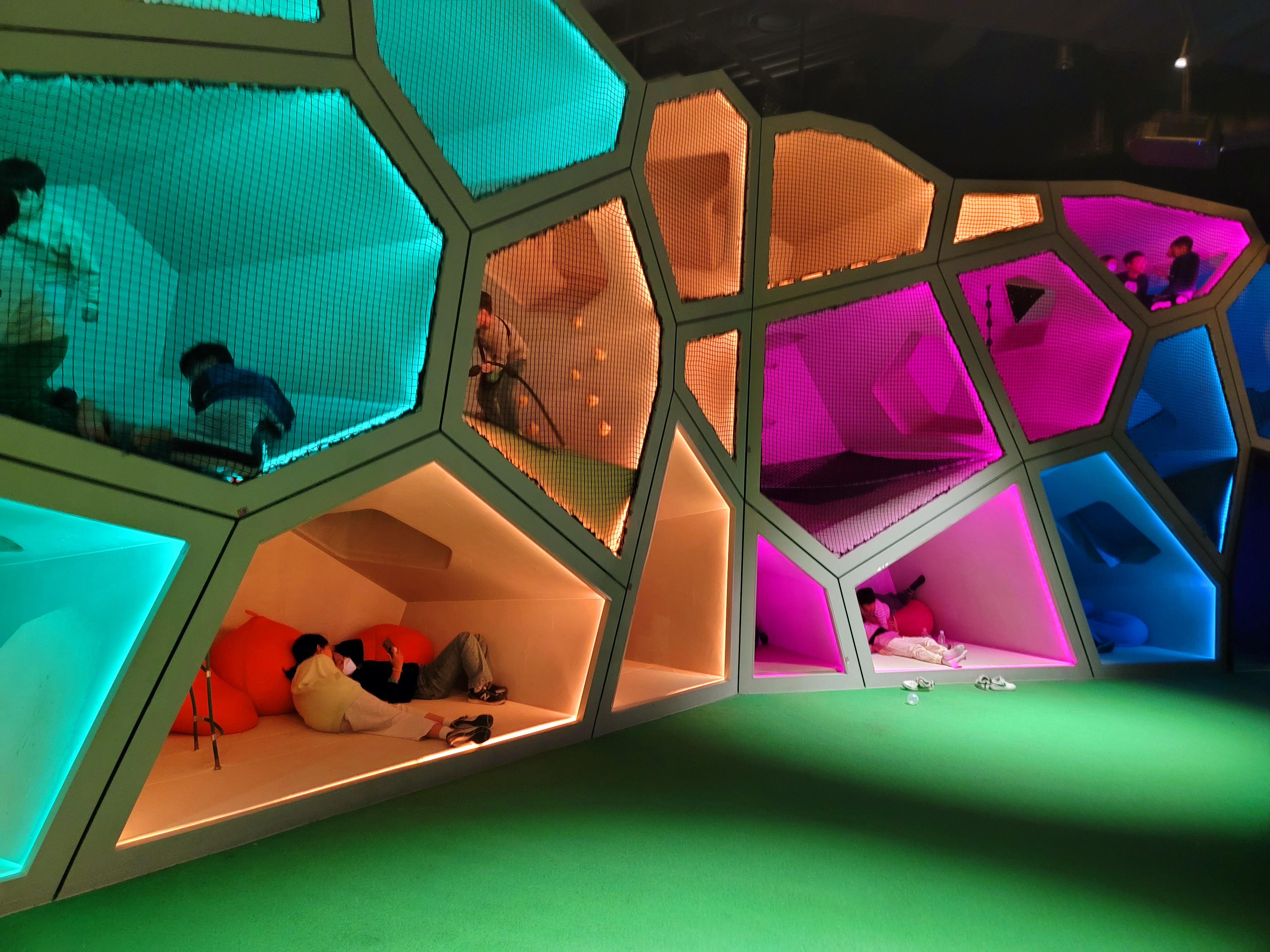 그냥 빈백만 놓여져 있는 곳도 있고요. 어떤 곳은 벌집처럼 공간이 나뉘어져 있는데 그 공간들을 이동할 수 있게 만들어 놓았더라구요. 아이들이 왔다갔다하며 즐기는 모습이 보였어요.