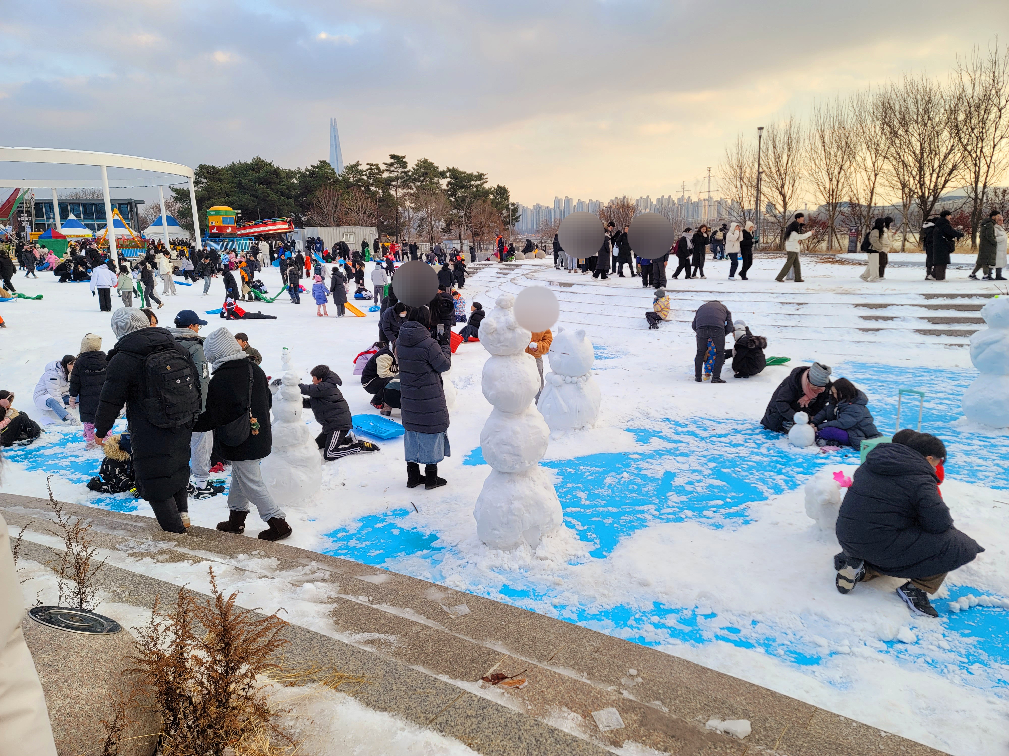 놀이기구 옆에 위치한 눈놀이동산인데요. 다들 멋지게 눈사람을 쌓았죠? 여긴 특별히 준비되어 있는 건 없어요. 눈 뿐.