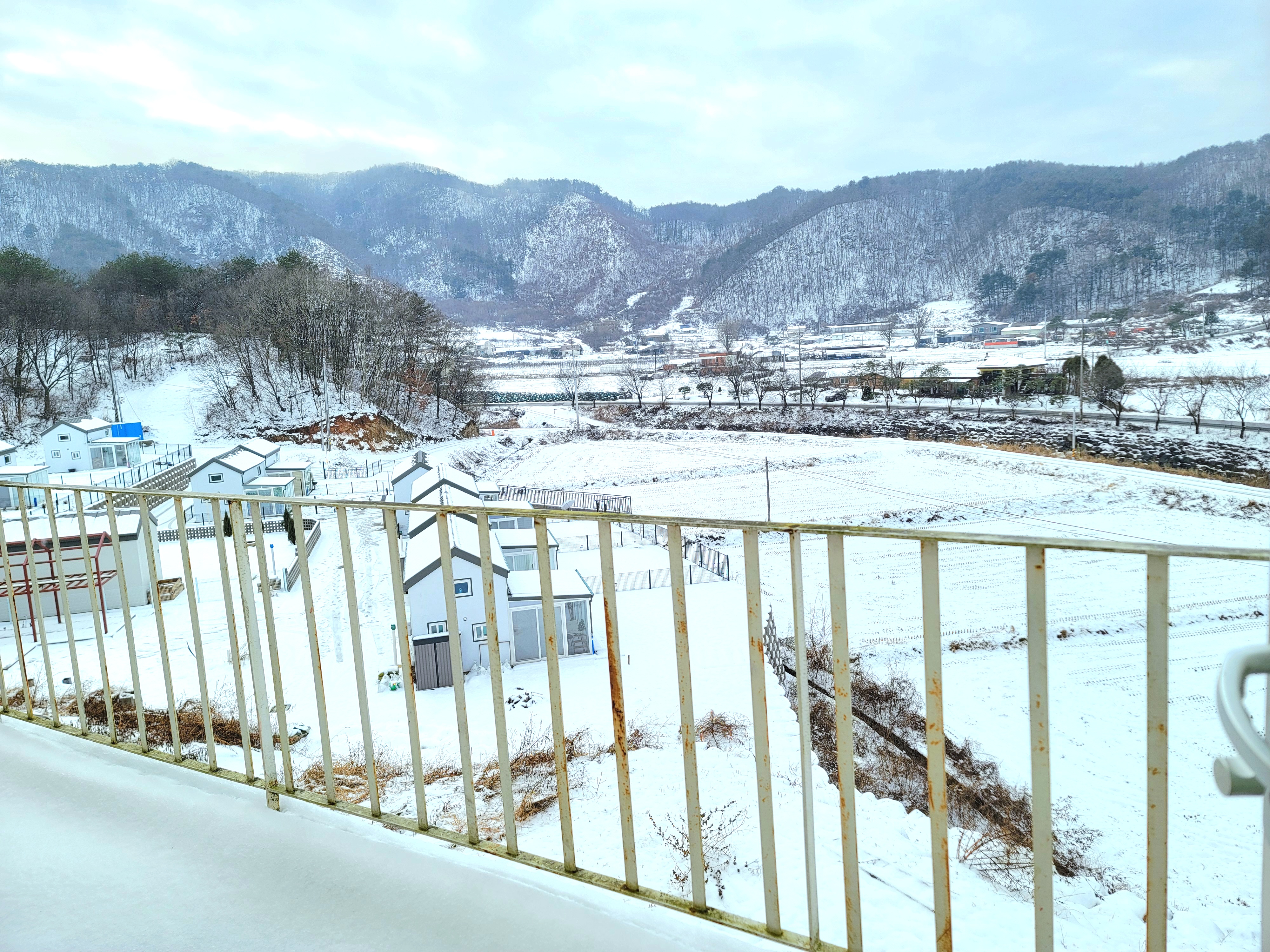 거실 창문은 TV를 사이에 두고 두 개가 있어요. 위 사진은 오른쪽 창문을 열어 본 모습입니다. 눈이 지붕들을 덮어 동화 속 그림을 연상시키죠. 산도 멋드러집니다.
