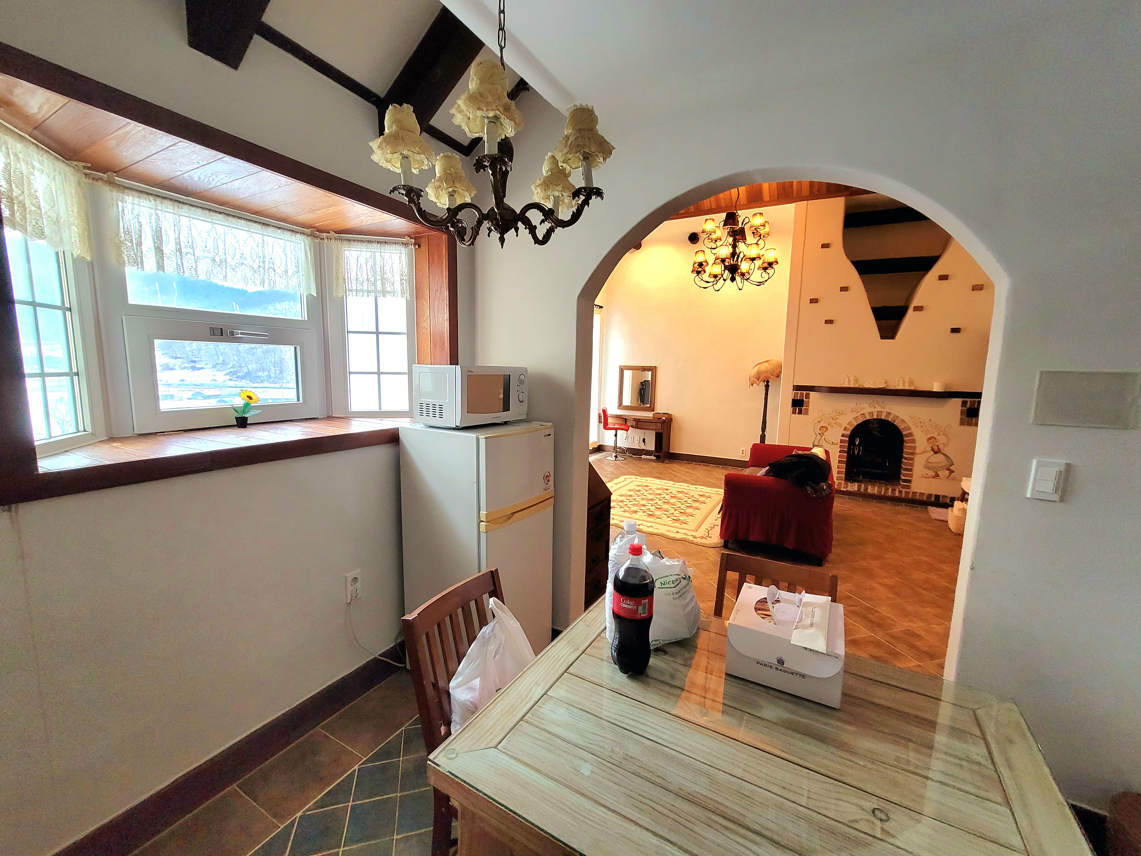 주방에서 본 거실이에요. 여기도 샹들리에가 있네요. 전자레인지가 있어 음식을 데워먹기 좋았고요. 창문 쪽 보시면 조화지만 해바라기가 있어요. 사장님의 애정이 묻어나 있는 듯 하죠. 예쁘다고 생각했습니다.