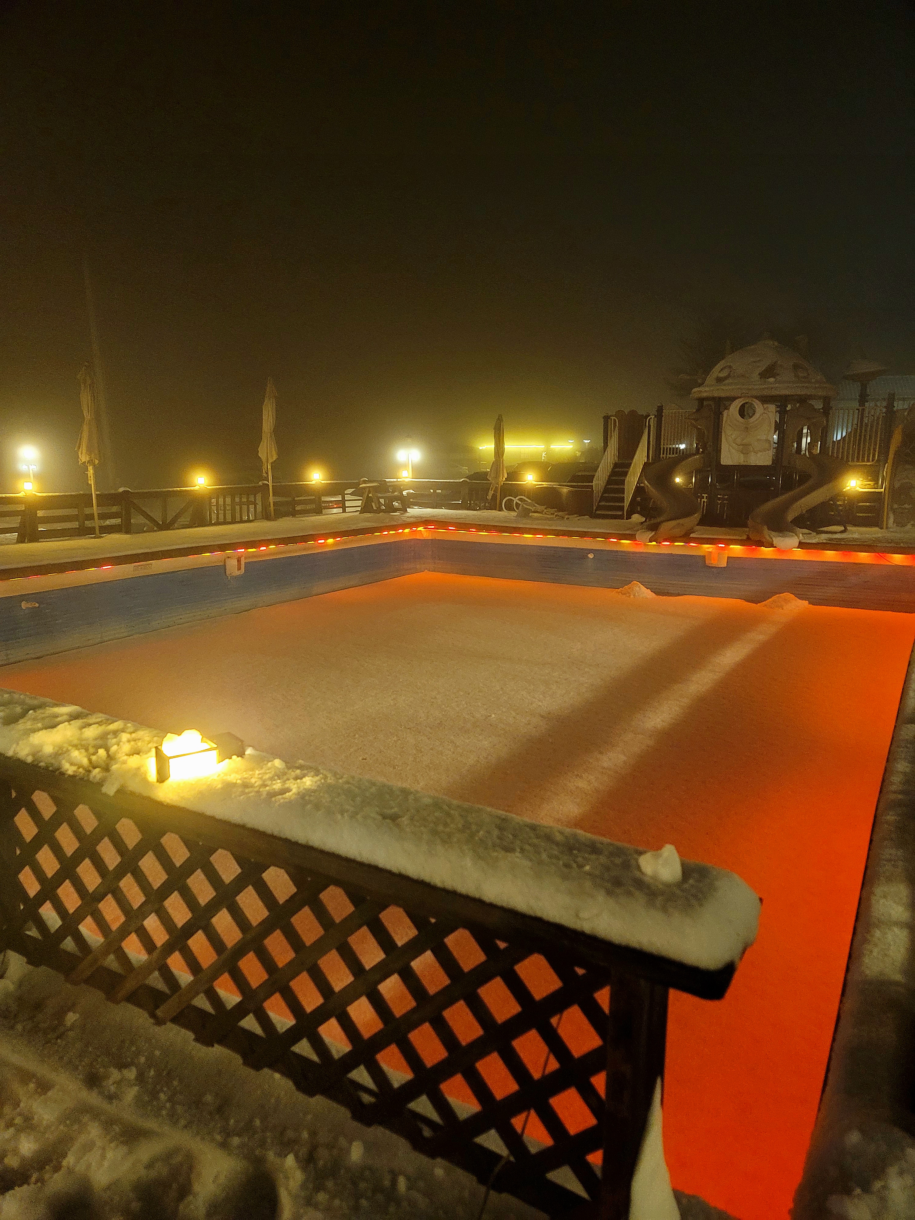 바베큐장 바로 옆에 있는 수영장이에요. 여름에는 수영장으로 변신한다고 합니다. 사장님이 동영상을 보여주셔서 봤는데, 음악도 번쩍번쩍! 조명도 번쩍번쩍! 꼭 클럽 같기도 하더라고요.