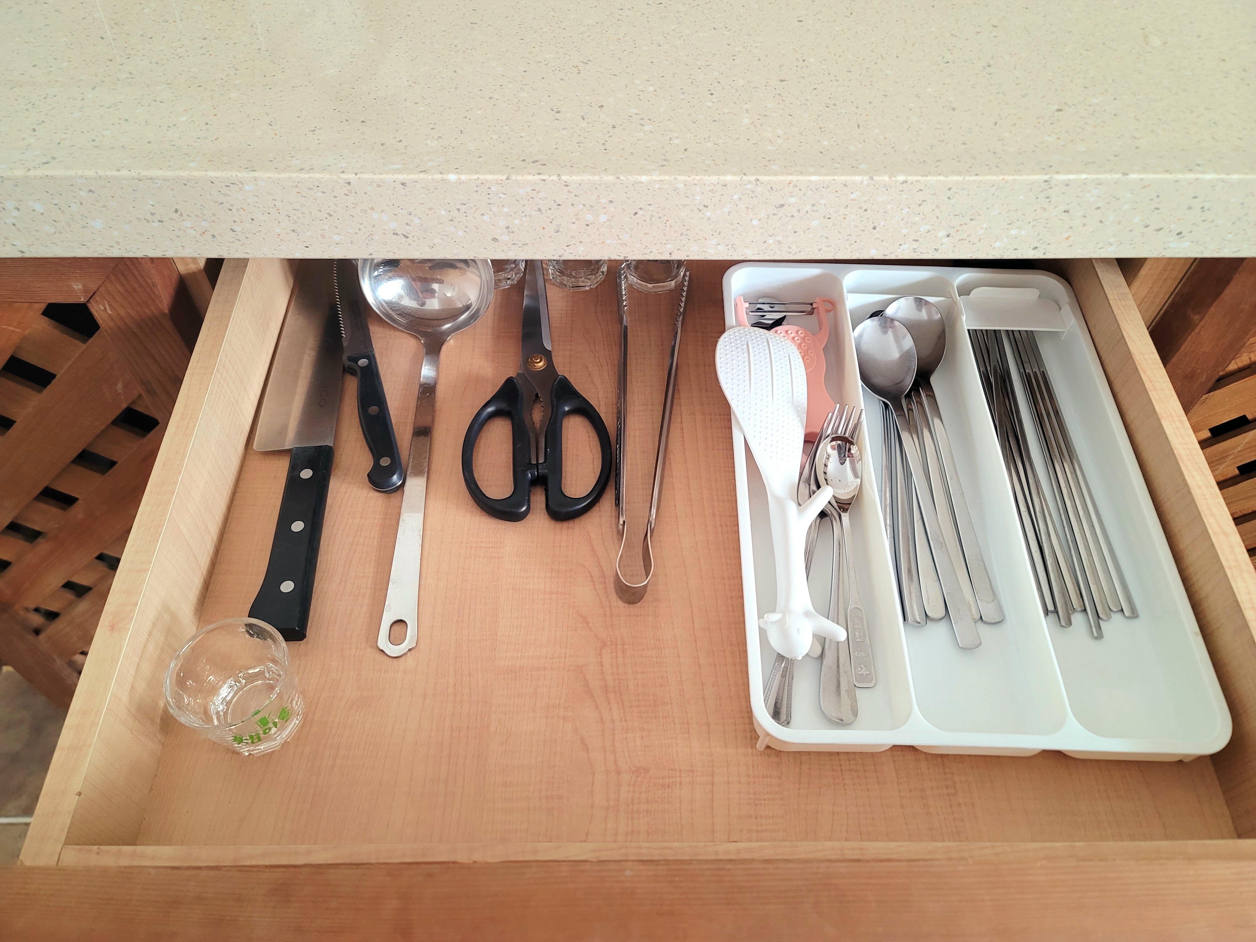 서랍을 열면 있는 조리도구들 및 수저젓가락 등입니다. 감자칼도 있네요. 그리고 사진에 담지는 못 했지만 수세미와 행주도 준비가 되어 있었어요. 비닐째 새 것이었고요. 이용객들이 올 때마다 새로 갈아주시는 듯 합니다.