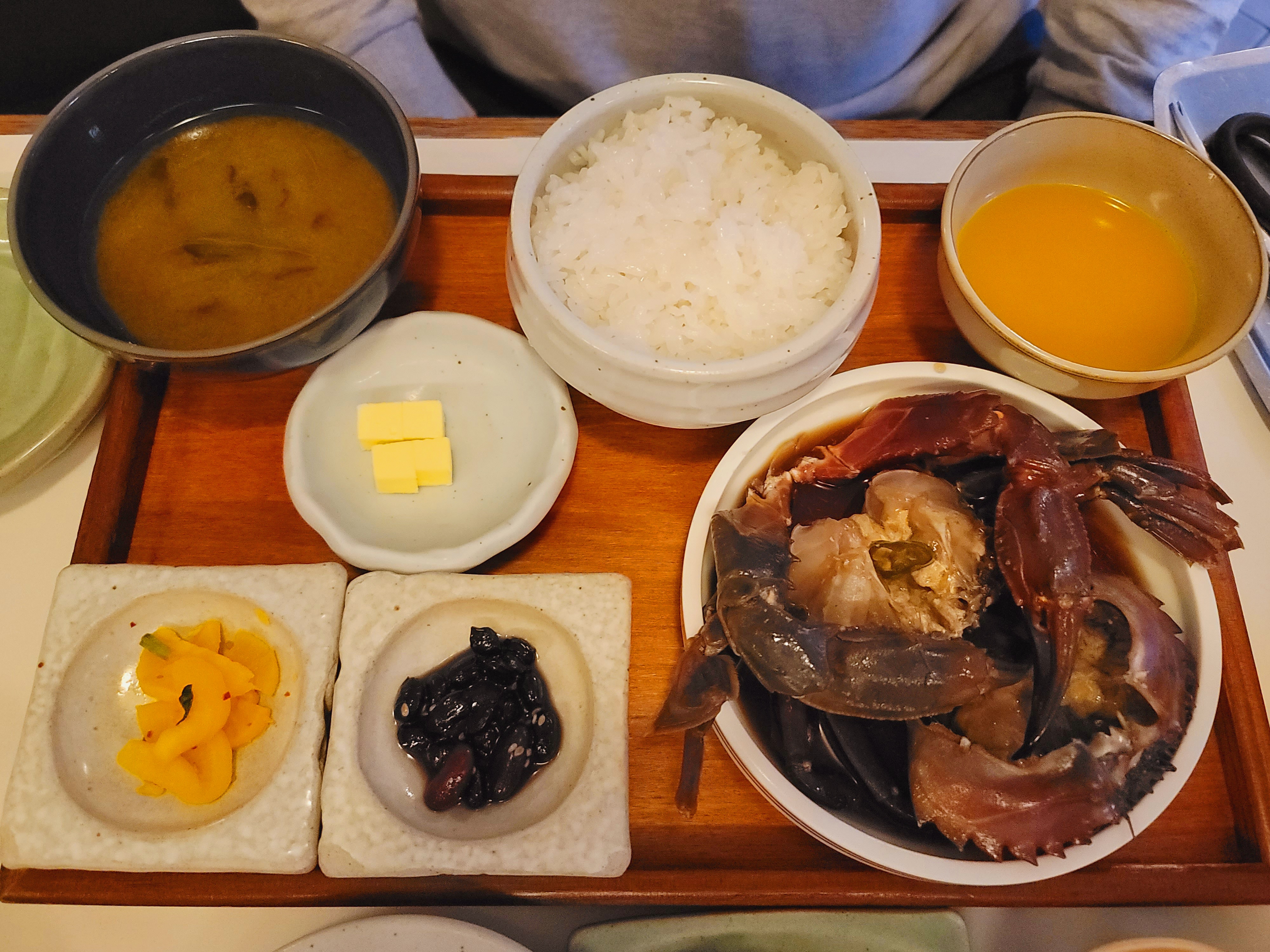 맛있는데 조금 쓰다고 했어요. 아마 내장 부분 쪽 맛이 강했나보죠? 그래도 준비해주신 가위로 다리까지 싹뚝싹뚝 잘라, 발라 먹으면서 밥 한 공기 클리어 하는 모습을 보았습니다. 버터까지 올려 야무지게 먹던데요...