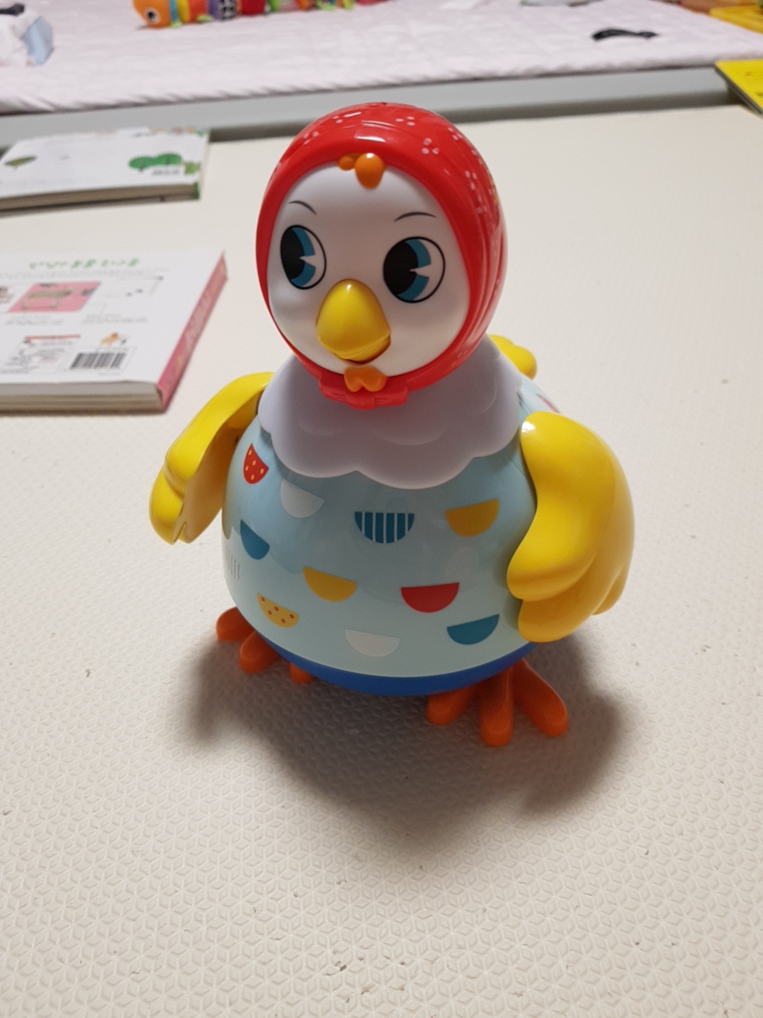꼬꼬맘은 푹신한 이불에선 당연히 움직이지 않으며 바닥이나 매끈한 매트 위에서 자유롭게 돌아다닌다. 우리 아기는 지금 어라운드 위고에 한창 매달려있는 시기인데, 발 밑에 자꾸 얼쩡(?)거리는 꼬꼬맘을 발로 차거나 위고에서 내려와 본격적으로 꼬꼬를 물고 뜯고 탐구해보는 시간을 가지곤 한다. 교구로서의 기능이나 생각하게 만드는 장난감은 아니기 때문에 그런걸 원하시는 분들은 구매하지 않는걸 추천드린다.
